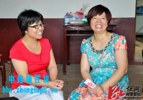 卢友招(右)接过彭艳(左)的600元现金后,开心地笑了。