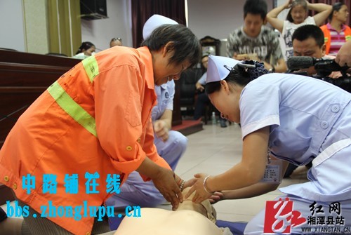 在急救知识讲座上,县人民医院护理部相关负责人结合环卫工人的工作实际,生动讲述了中暑的预防与急救、低血糖的预防与急救、雷电伤的预防与急救、猝死急救等方面的内容。在随后的徒手心肺复苏术现场指导中,环卫工人们围在人体模型四周,聚精会神地学习医护人员的示范动作并动手实践,力争掌握每个动作要领。