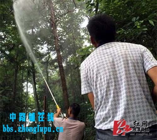 工作人员在喷洒药物 受今年高温、多雨天气等影响,石鼓镇辖区内的部分山林遭遇了病虫危害。针对严重的森林病虫害灾情,该镇林业站工作人员及时到现场研究防治方案,并结合虫害的特征,制定了采取机械药剂喷雾的方式防治病虫害的方案。